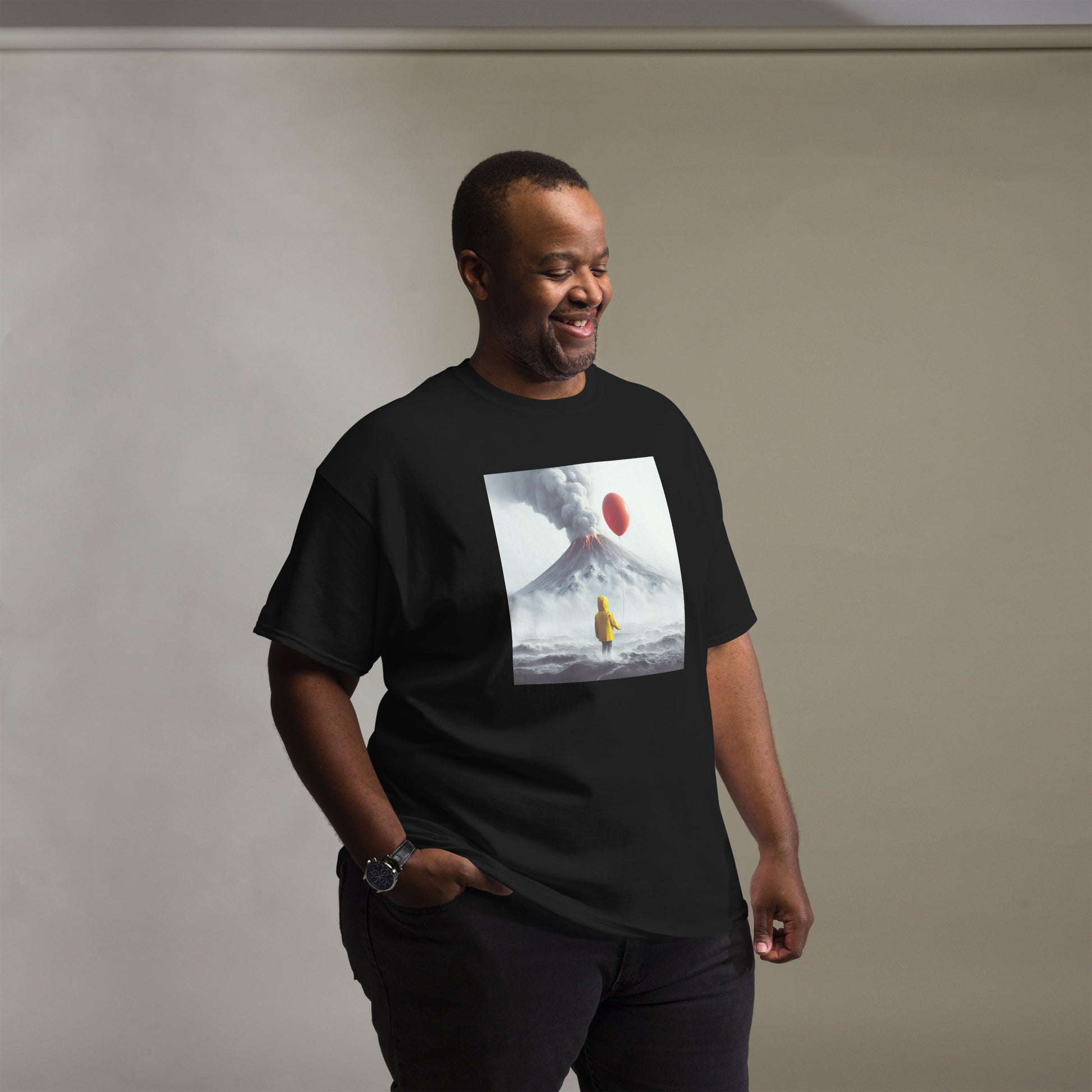 A Boy Wearing A Yellow Raincoat Holding A Red Balloon Looking Into A Smokey Volcano Men's Classic T-Shirt